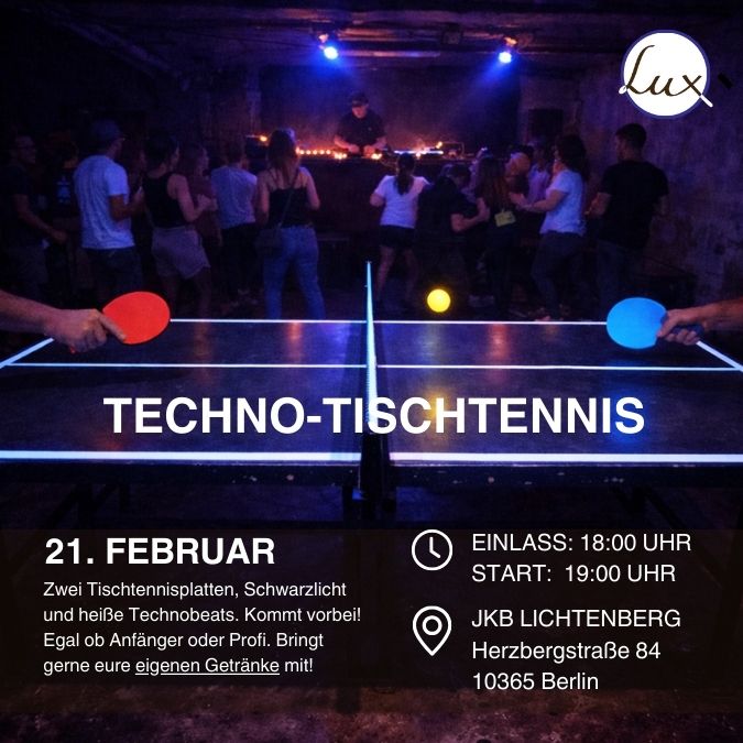 Tischtennisplatten + DJ + Schwarzlicht = LUX TECHNO TISCHTENNIS Kommt vorbei, spielt, tanzt, lacht oder habt einfach nur die Gemeinschaft miteinander. Ein Techno-Floor und ein Der-Gewinner-bestimmt-die-Musik-der-nächsten-Runde-Floor. Kommt vorbei, schaut es euch an und feiert mit uns!