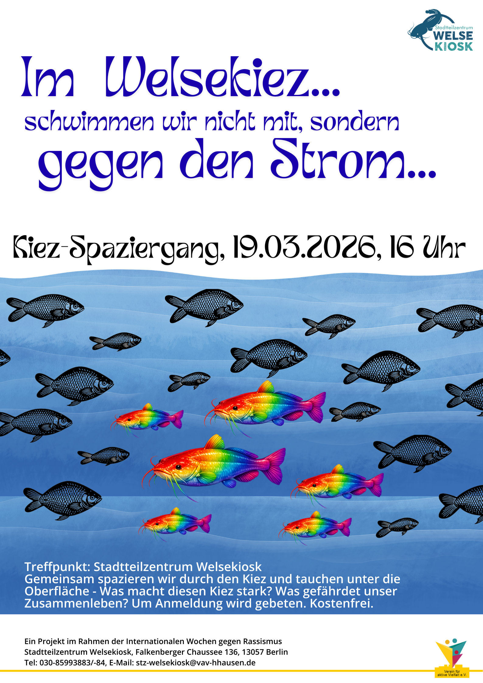 Im Welsekiez... schwimmen wir nicht mit, sondern gegen den Strom... Treffpunkt: Stadtteilzentrum Welsekiosk Gemeinsam spazieren wir durch den Kiez und tauchen unter die Oberfläche - Was macht diesen Kiez stark? Was gefährdet unser Zusammenleben? Um Anmeldung wird gebeten. Kostenfrei. Ein Projekt im Rahmen der Internationalen Wochen gegen Rassismus Stadtteilzentrum Welsekiosk, Falkenberger Chaussee 136, 13057 Berlin...