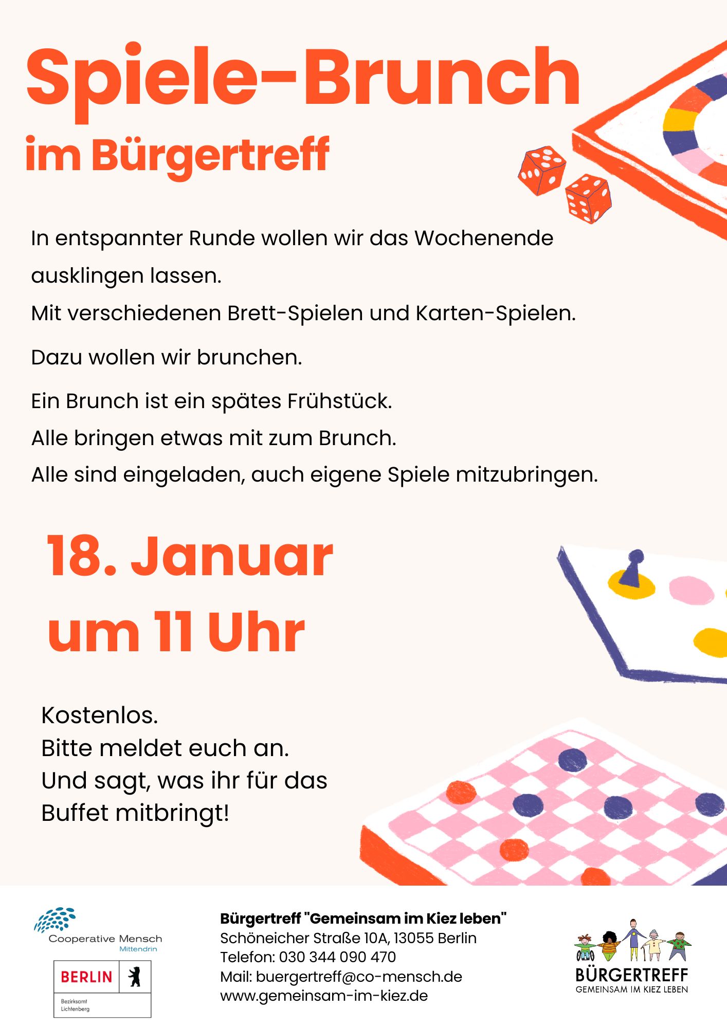 Kiezbrunch: Neujahrsauftakt Wir möchten das Jahr mit unserem neuen Angebot mit Euch begrüßen. Wir werden ein paar Leckereien vor Ort haben. Ihr seid herzlich eingeladen euren Lieblingsaufschnitt, -obst, -saft oder ähnliches mitzubringen. Für die bessere Planung meldet euch gern an! Wir freuen uns auf Euch!