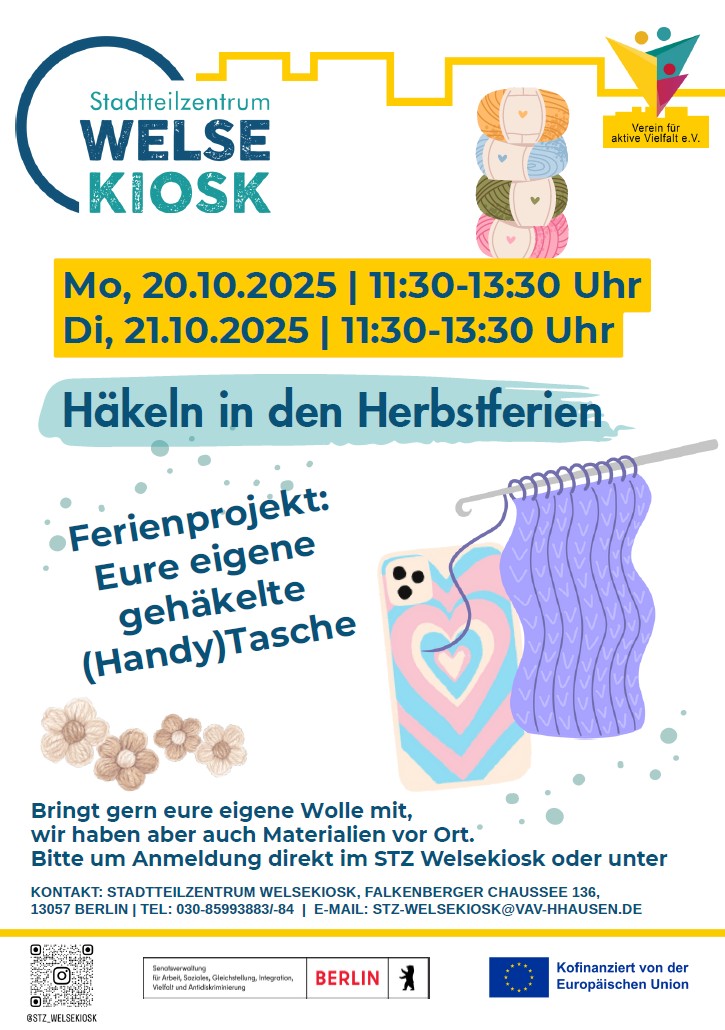 Ferienprojekt: Eure eigene gehäkelte (Handy)Tasche Bringt gern eure eigene Wolle mit, wir haben aber auch Materialien vor Ort. Bitte um Anmeldung direkt im STZ Welsekiosk oder unter , 030 85993883 💰kostenfrei
