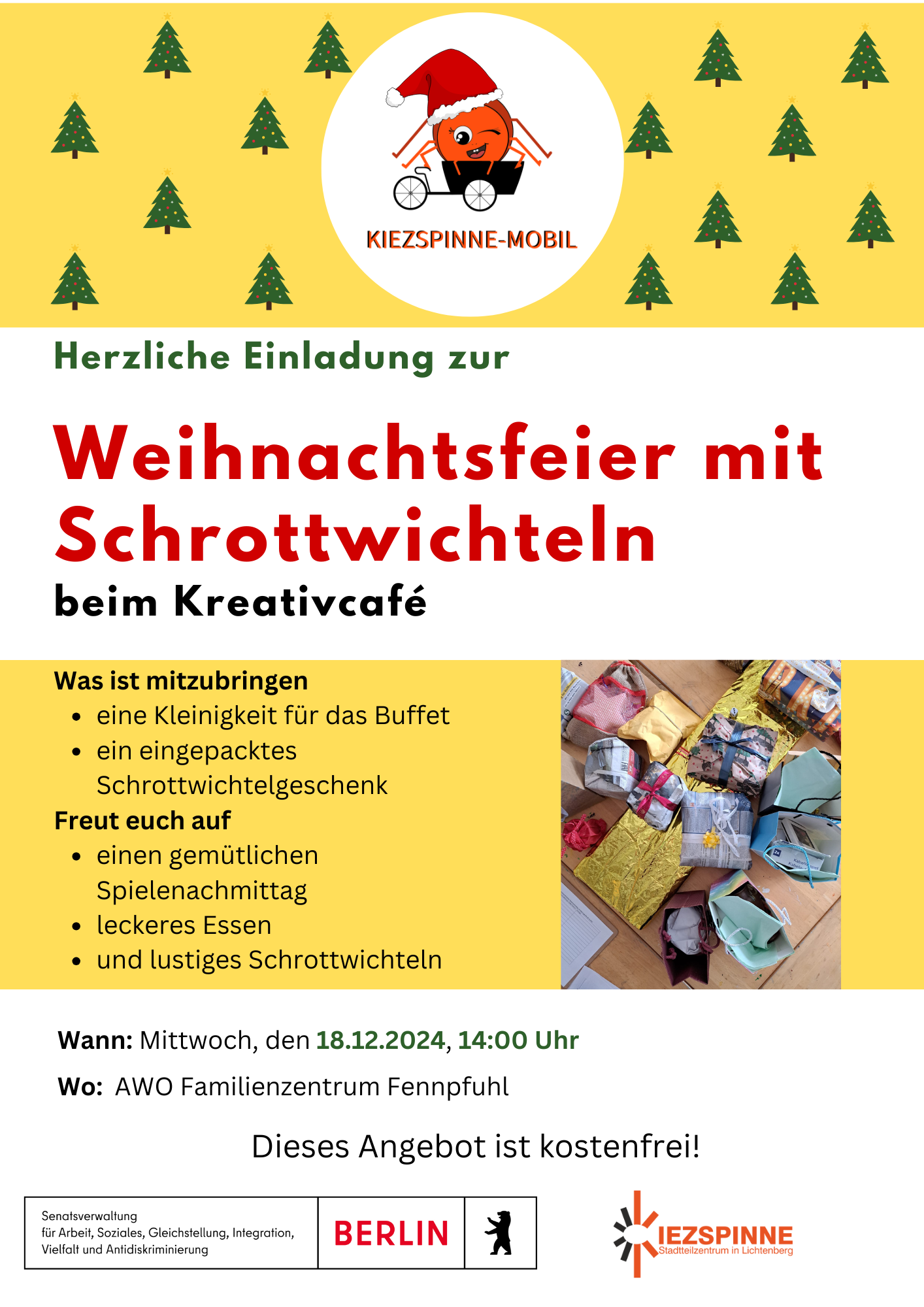 🎄 Einladung zur Weihnachtsfeier mit Schrottwichteln 🎄 Das Kreativcafé lädt herzlich zu einer fröhlichen Weihnachtsfeier ein! 📅 Wann: Mittwoch, 18.12.2024, von 14 bis 18 Uhr 📍 Wo: AWO Familienzentrum, Otto-Marquardt-Str. 8, 10369 Berlin 💸 Kosten: kostenfrei Freuen Sie sich auf: Einen gemütlichen Nachmittag in geselliger Runde Leckereien vom Buffet Lustige Spiele und unser beliebtes Schrottwichteln...